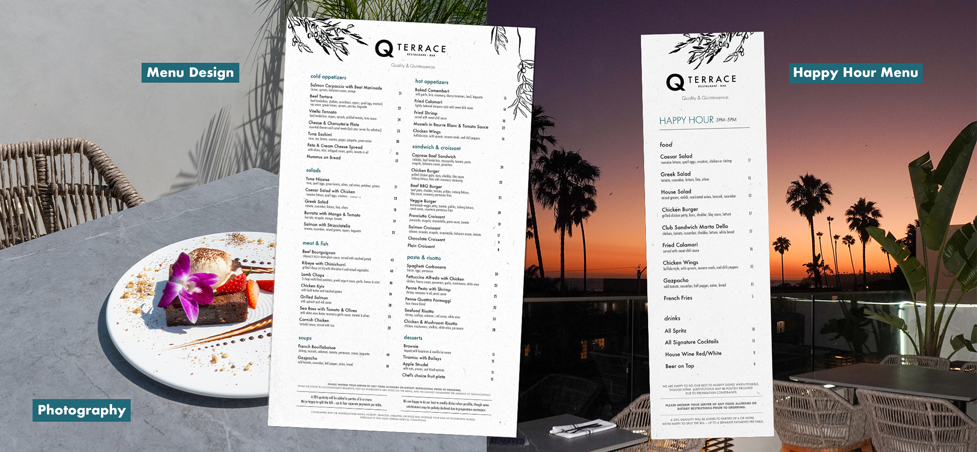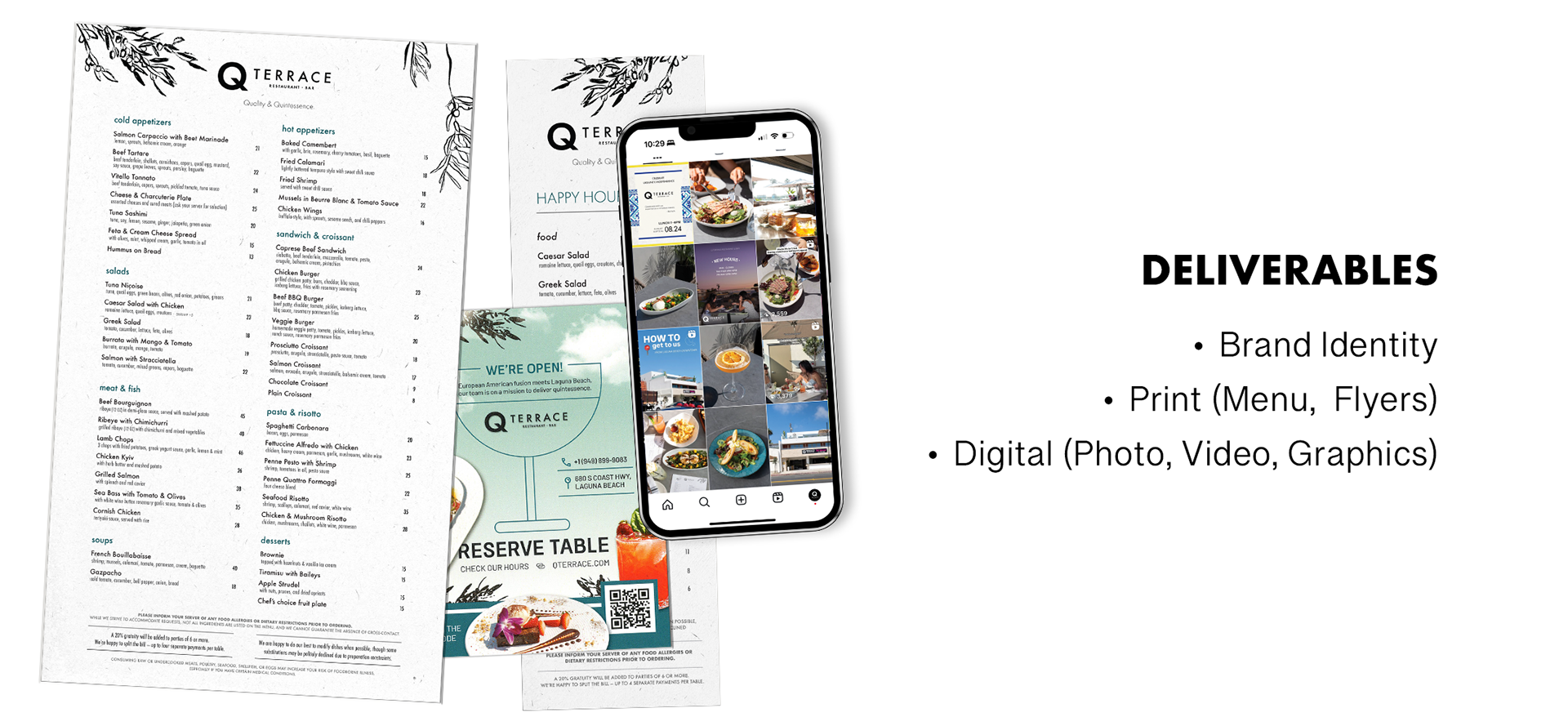 As a Digital Marketing Specialist at Q Terrace, my main objective was to establish the restaurant’s creative direction and cohesive branding in the location of Laguna Beach, in California.